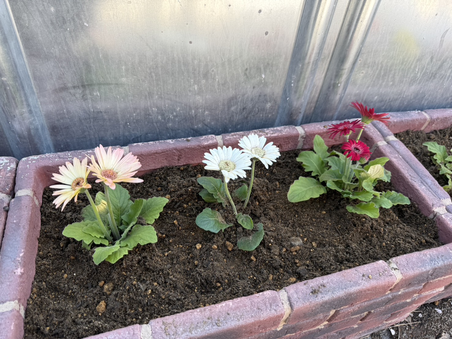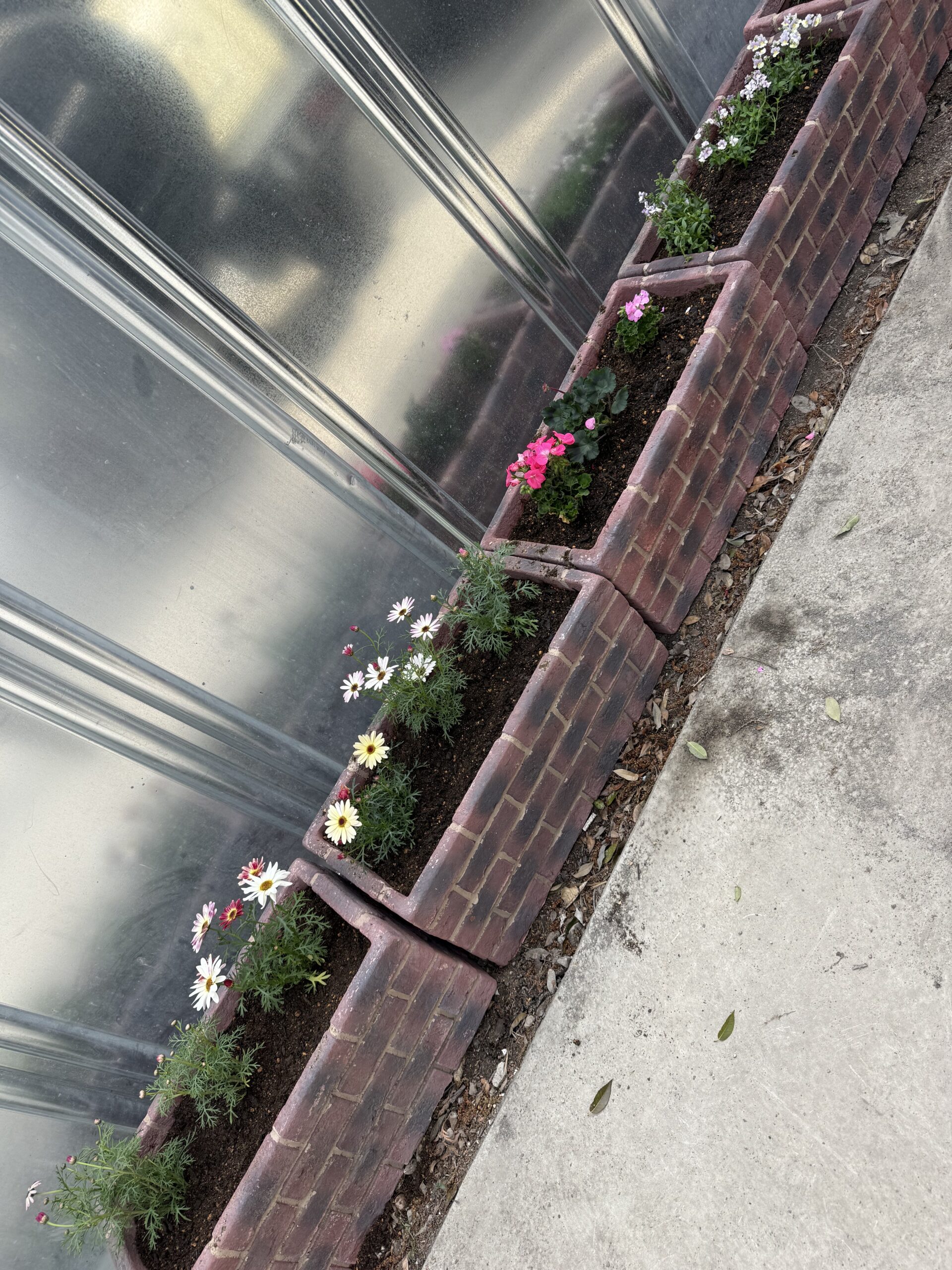 ピンク・白・黄色・赤と、カラフルなお花をバランスよく並べてみたところ、ぐっと華やかな雰囲気に✨ レンガのプランターとも相性ばっちりです。