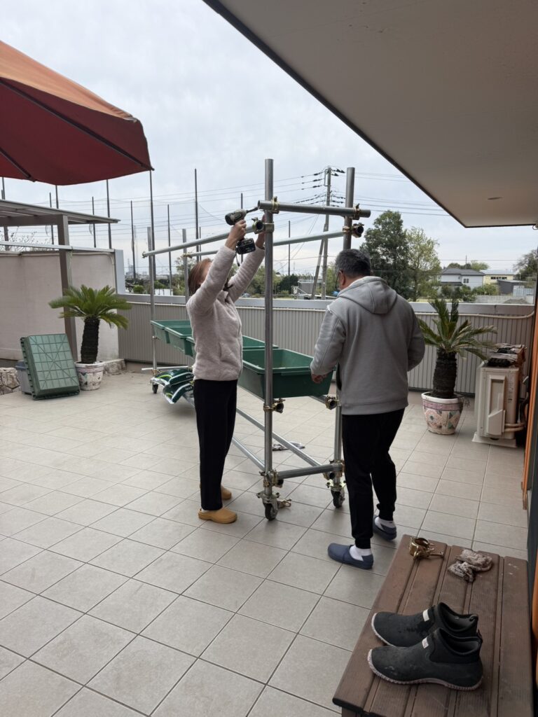 今回はテラスで、何やら金属パイプを組み立ててフレームを作成中🏗️ 電動ドリルを片手に、細かい調整をしながら着々と形にしていく姿は、見ていて毎回感心させられます👏