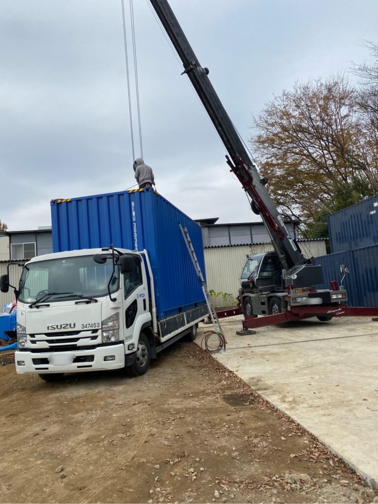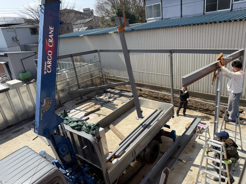 現在、会社に新しい車庫を建設しています🚧社長がユニックを操縦し、社員がそれぞれの持ち場で声を掛け合いながら作業を進めています💪細かな調整や資材の運搬など、一つひとつの工